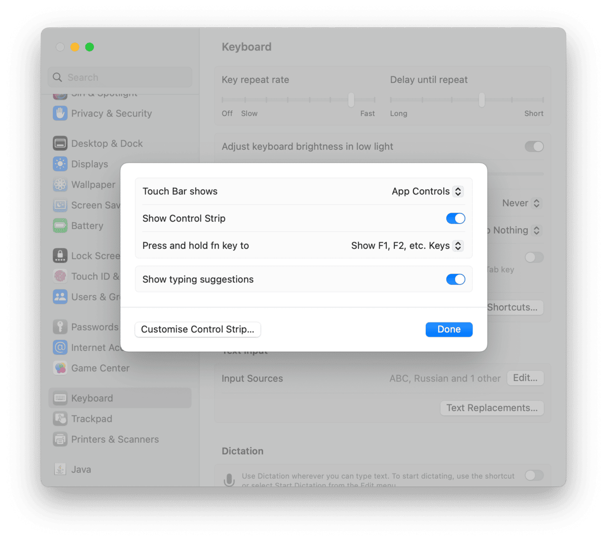 Sistem Ayarları> Klavye'ye gidin. Çubuğa Dokunma Ayarları'nı tıklayın - Bir pencere açılır. 'Dokunma çubuğu şovlarının' yanındaki açılır menüsünden 'Uygulama Kontrolleri' seçin ve 'Kontrol Şeridi'ni Göster' üzerindeki geçiş yapın.