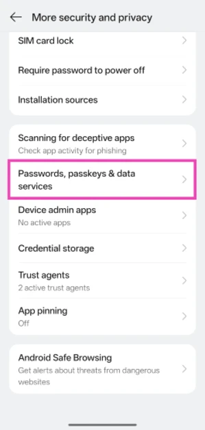 3. Adım:Aşağı kaydırın ve üzerine dokununŞifreler, Passeyler ve Veri Hizmetleri.