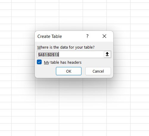 Adım 6: tıklayınTAMAMVeri aralığının doğru olduğunu onaylamak için Tablo Oluştur iletişim kutusundaki düğme.
