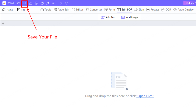 İlk olarak, pencerelerinizde veya macOS bilgisayarınızda veya dizüstü bilgisayarınızda pdfull'i başlatın. Seçme "Dosyaları Aç”Ve metin değişiklikleri yapmak istediğiniz PDF belgesini seçin. Kısa sürede dosyalara kolay erişim sağlamak için grafik kullanıcı arayüzü geliştirilmiştir.