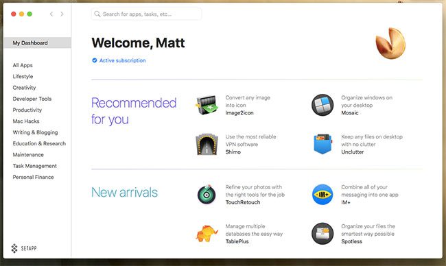 MacPaw'ın SetApp Abonelik Hizmeti, App Store'daki tüm program kataloğuna erişim sağlayan küçük bir aylık ücret talep ederek bu sorunu çözmeye çalışır. Geçerli bir aboneliğiniz olduğu sürece, istediğiniz herhangi bir uygulamayı indirebilir ve istediğiniz amaç için kullanabilirsiniz.