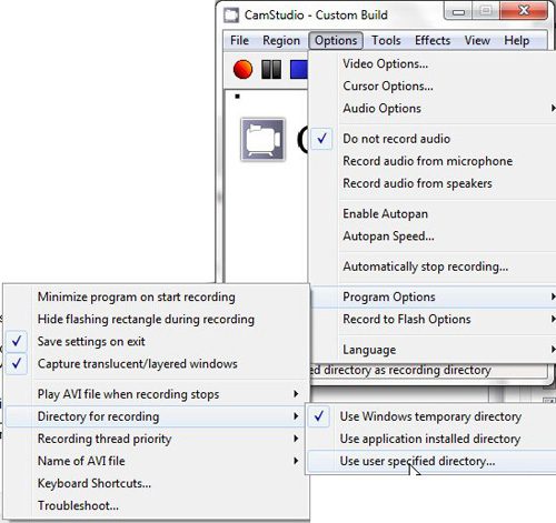 Son öğeSeçeneklerayarlamanız gereken menü tıklayarak bulunurProgram SeçenekleriondanSeçeneklerMenü, sonraKayıt için dizin, sonra sonundaKullanıcı tarafından belirtilen dizin kullanın. Bu noktada, kaydedilen videoların kaydedildiği bilgisayarınızdaki klasörü belirleyebilirsiniz.