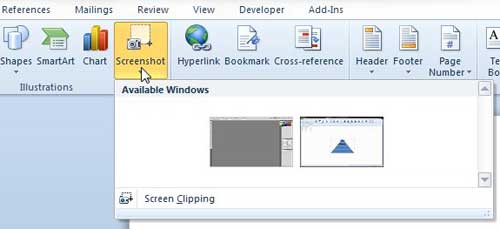 Ancak Word 2010, doğrudan program içinden bir ekran görüntüsü almanıza izin veren bir yardımcı programa sahiptir, böylece süreci bir angarya haline getirebilecek tüm ekstra adımları reddeder.