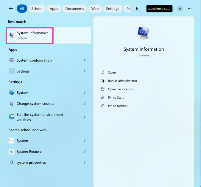 1. Adım:Tip 'Sistem bilgileri'Arama çubuğunda ve ortaya çıkan ilk sonucu açın.