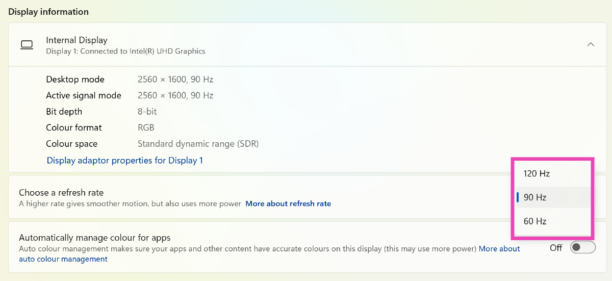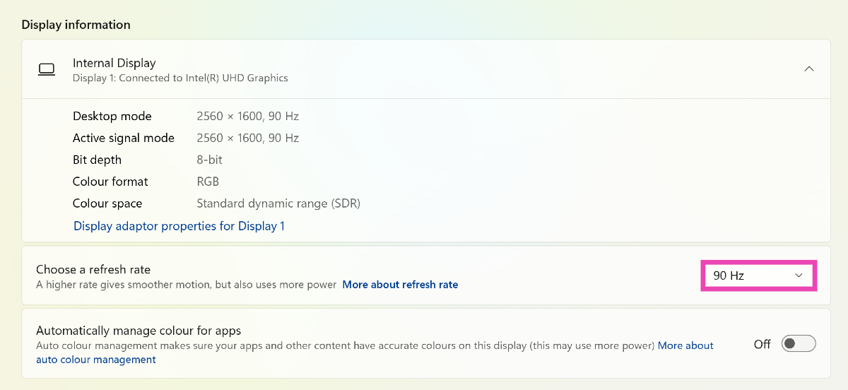 Gidip gelmekAyarlar> Sistem> Ekran> Gelişmiş Ekranve uygun seçeneği seçmek için 'Yenile Hızı' nın yanındaki açılır menüye basın.