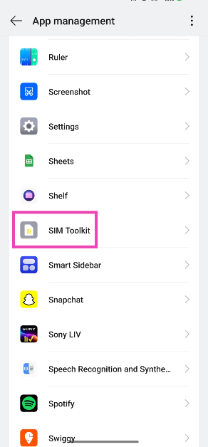 3. Adım:Aşağı kaydırın ve seçinSIM araç seti. Sim Toolkit'i bulamazsanız,elipslerEkranın sağ üst köşesinde ve seçinSistem Uygulamalarını Göster.
