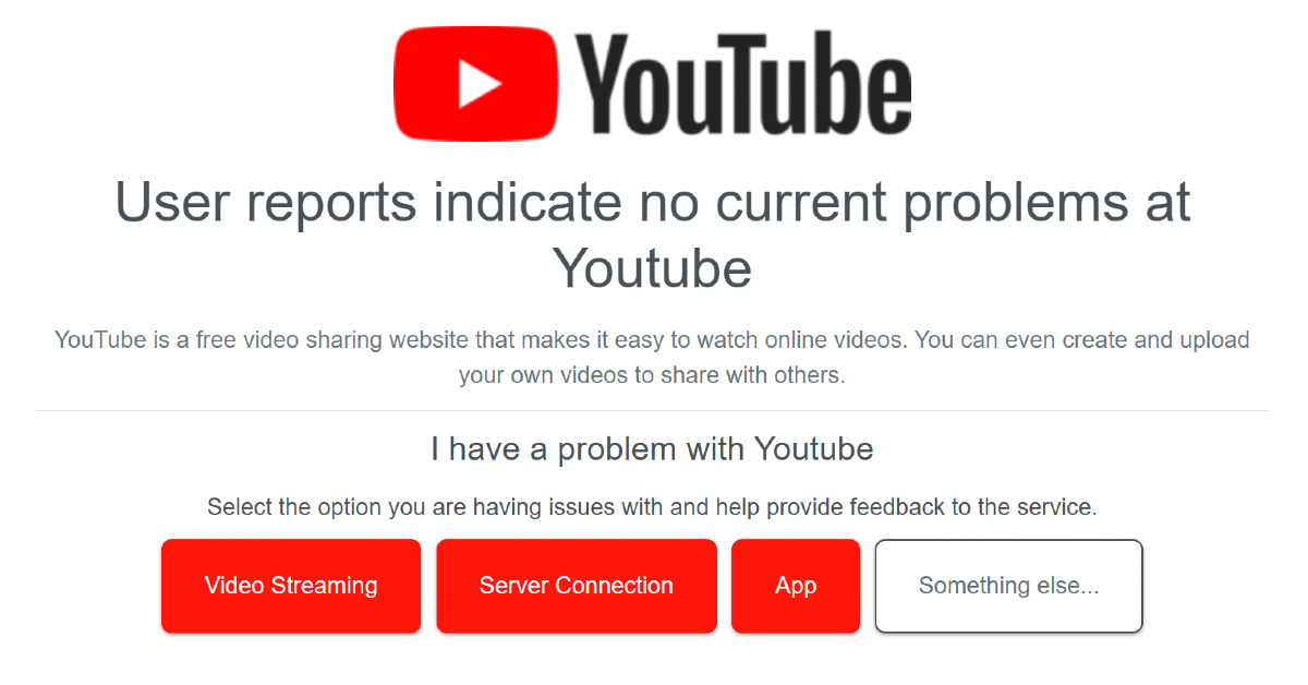 YouTube'un sunucularının aşağı olması, yanlışlıkla kazalara yol açabilir. Gidip gelmekDowndetector.inve durumun bu olup olmadığını kontrol etmek için YouTube'u arayın. Son kullanıcı raporlarında bir artış fark ederseniz, YouTube'un bir sunucu kesintisi yaşadığı anlamına gelir. Bu durumda yapabileceğiniz tek şey, Google'ın sunucularını geri yüklemesini beklemektir.