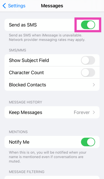 Gidip gelmekAyarlar> Uygulamalar> Mesajlarve 'SMS olarak gönder' yanındaki geçiş anahtarını açın.