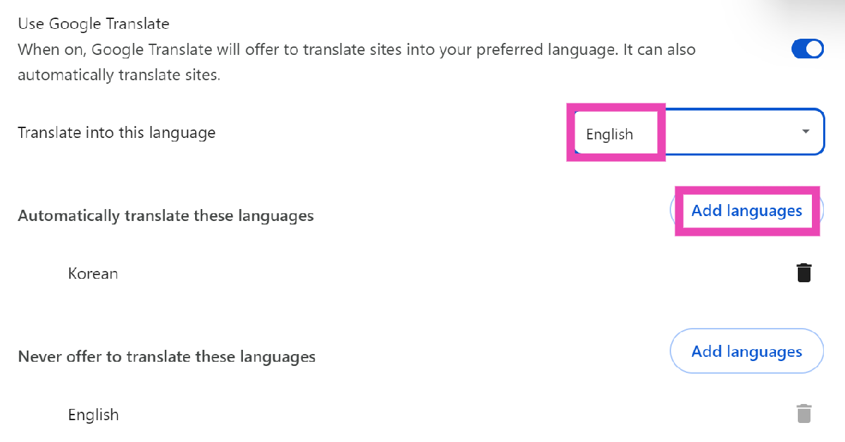 PC'de gitChrome Ayarları> Diller> Google Çeviriyi Kullanınve giriş ve çıkış dillerini ayarlayın.