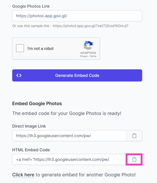Fotoğraf/albüm bağlantısını kopyalayın, gömme kodunu oluşturun ve medyayı gömmek için HTML bağlantısını web sitenize yapıştırın.