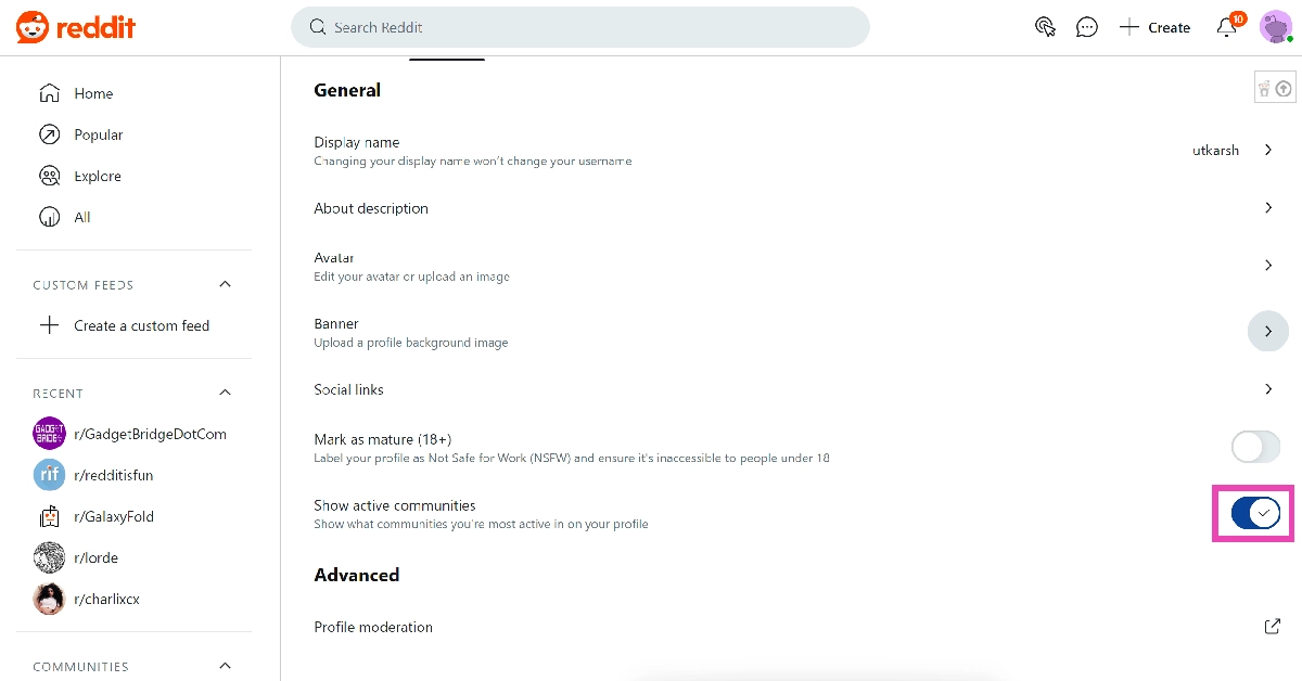 Reddit profilimde aktif toplulukları nasıl gizlerim?