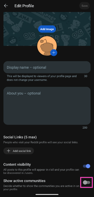 Reddit uygulamasını telefonunuzda başlatın, profilinize gidin, 'Düzenle'ye dokunun ve' Aktif Toplulukları Göster'in yanındaki geçiş anahtarını kapatın.