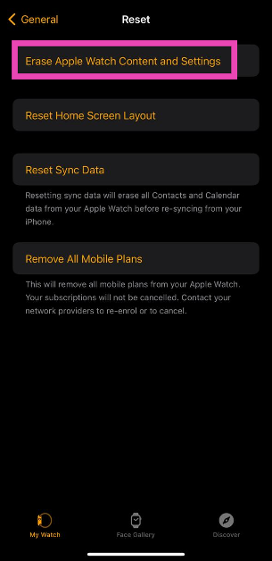 İPhone uygulamasını iPhone'unuzda başlatın,Saatim> Genel> Sıfırlama> Apple Watch İçeriğini ve Ayarlarını Silve açılır kutudaki seçiminizi onaylayın. Eylemi doğrulamak için Apple Kimliğinizi girin. İzlemeyi tekrar ayarlayın ve yedeklemenizi geri yükleyin. Yeni bir parola girebileceksiniz.