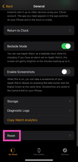 Ekranın sağ üst köşesindeki güç simgesini görene kadar Apple Watch'taki yan düğmeyi basılı tutun. Ardından, 'Tüm İçeriği ve Ayarları Silmeyi' görene kadar dijital tacı basılı tutun. VurmakSıfırlamakApple Watch'unuzu sıfırlamak için. Şimdi saatinizi tekrar ayarlayın ve yedeklemenizi geri yükleyin.