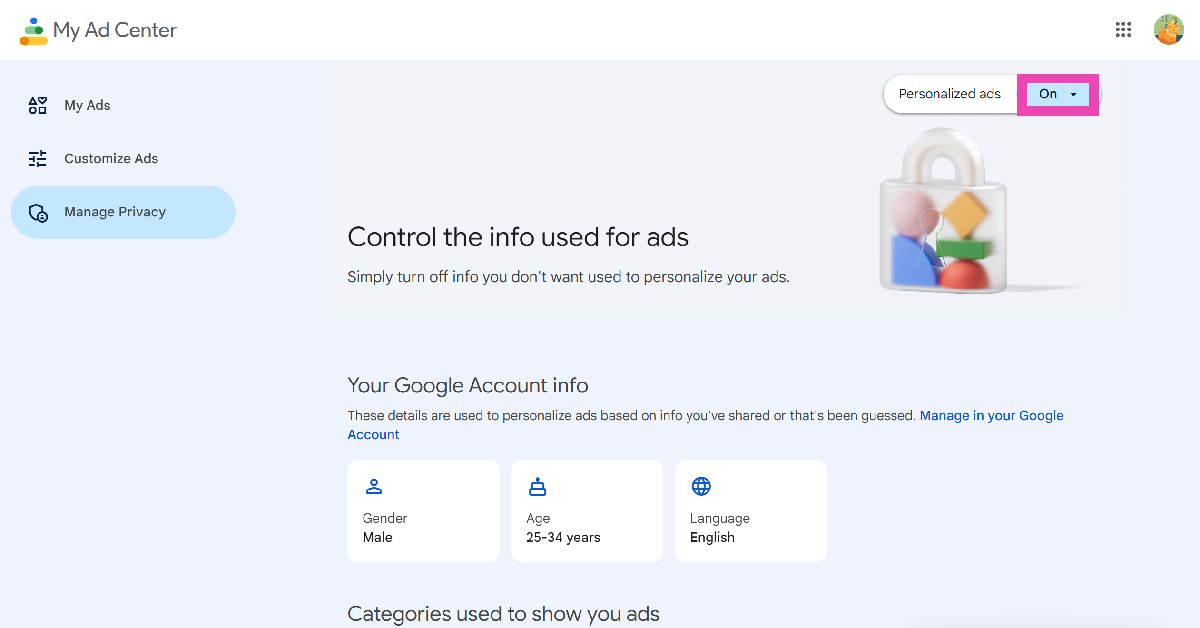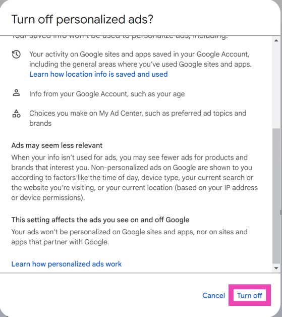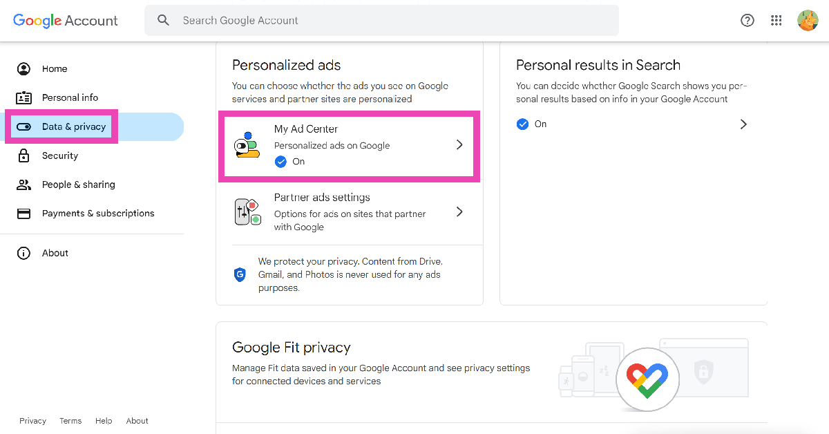 Google hesabınıza gidin ve seçinVeri ve Gizlilik> Reklam Merkezim> Kişiselleştirilmiş Reklamlarve 'Kapat'ı seçin.