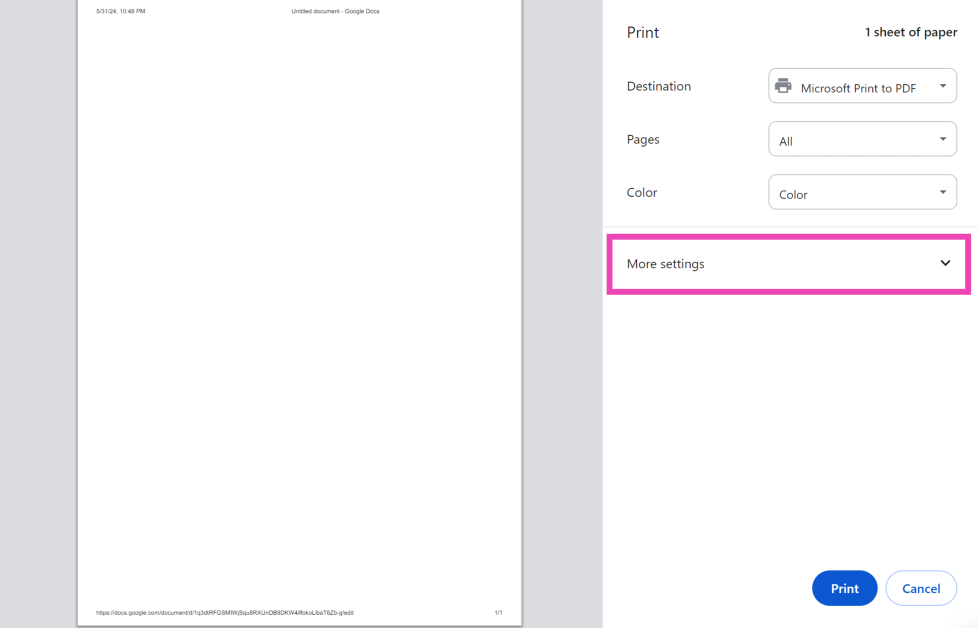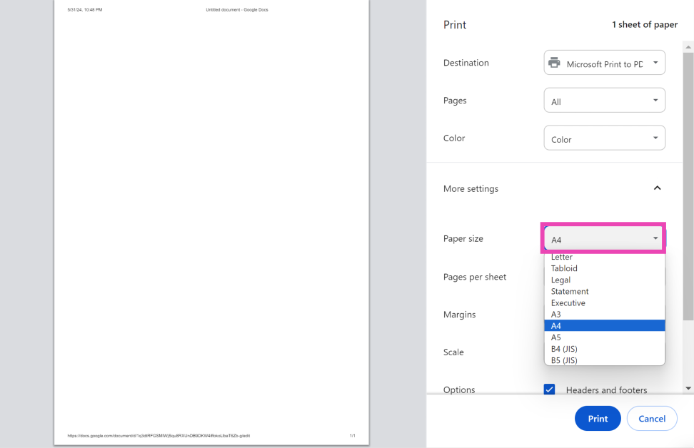 Baskı Önizleme penceresinde, daha fazla ayarı tıklayın, ardından 'Kağıt Boyutuna' basın ve tercih ettiğiniz boyutu seçin.