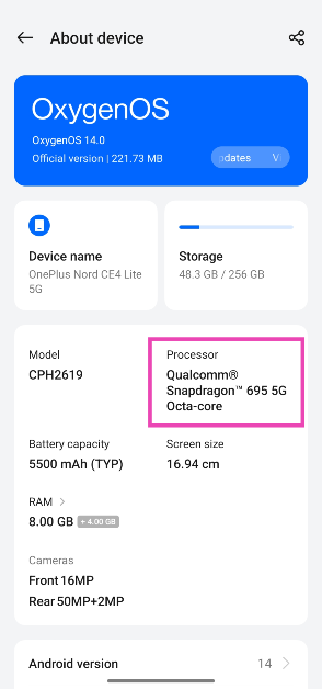 Telefon Ayarları: Telefonunuzun cihaz ayarlarında ayrıntılı bir 'Hakkında' bölümü varsa, işlemci bilgilerini orada kolayca bulabilirsiniz. Ancak, her OEM'in bu seçeneği yoktur. Samsung ve Google Pixel akıllı telefonlar, cihaz ayarlarında işlemci adını hariç tuttuğu için kötü şöhretlidir. Bir Çinli OEM'den bir akıllı telefonunuz varsa, bu sizin için ideal bir yöntemdir.