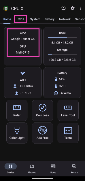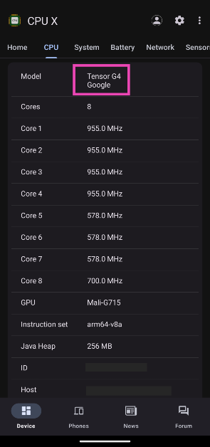 Üçüncü taraf uygulamalar: Google Play Store'da cihazınızla ilgili tüm önemli özellikleri üretebilen çok çeşitli cihaz bilgisi uygulamaları var. CPU X ve CPU Info gibi uygulamalar yalnızca cihazınızın kalbindeki yonga setinin adını değil, aynı zamanda bireysel çekirdeklerinin saat hızlarını da görüntüler.