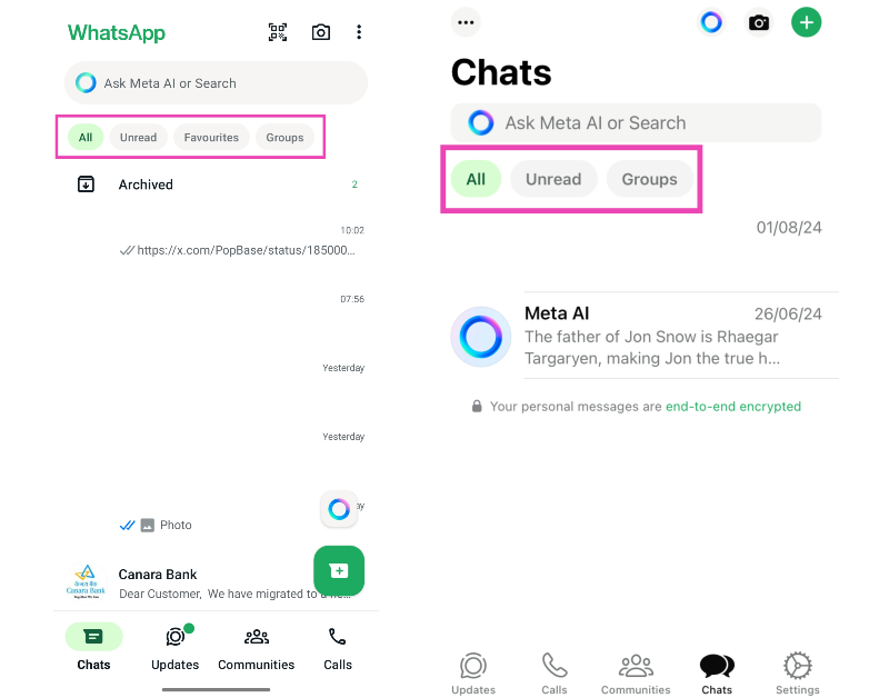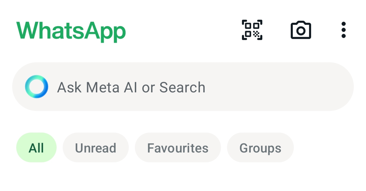 WhatsApp'ın ilk sekmesi sohbetlere adanmıştır. Diğer üç sekme güncellemeler, topluluklar ve çağrılar içindir.