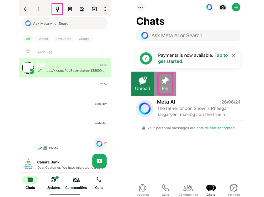 Kendinizi en çok erişirken bulduğunuz bazı sohbetler varsa, her mesaj göndermek istediğinizde konuşma sekmesinde kaydırmak yerine ekranın üstüne sabitlemek çok daha kolaydır. WhatsApp, en fazla üç sohbeti 'Sohbetler' sekmesinin tepesine sabitlemenize olanak tanır. Bir sohbeti sabitlemek için uzun süre basın ve ekranın üst kısmındaki araç çubuğundaki pim simgesine basın. İPhone kullanıcıları sadece bir sohbette hızlıca kaydırabilir ve 'pin'e çarpabilir.