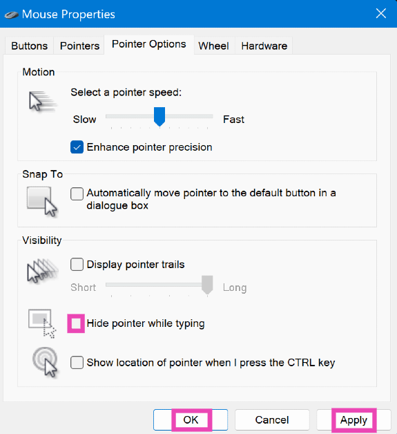 Windows + R tuşuna basın, kontrol faresini yazın ve Enter tuşuna basın, 'İşaretçi Seçenekleri' sekmesine geçin ve 'Yazarken Fare Pointer'ı gizle' yanındaki onay kutusunu seçin.