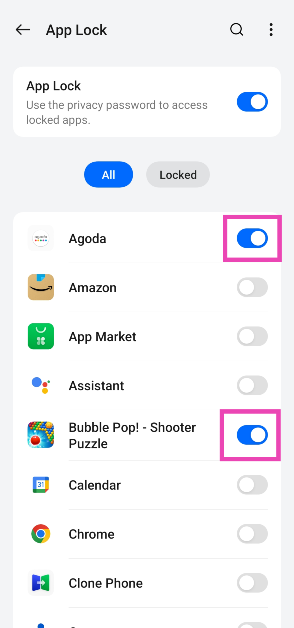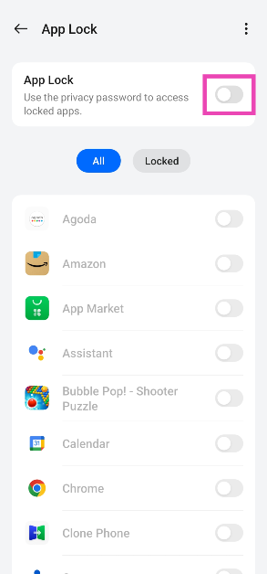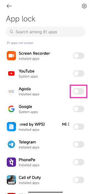 4. Adım:Açgeçiş anahtarıKilitlemek istediğiniz uygulama için.