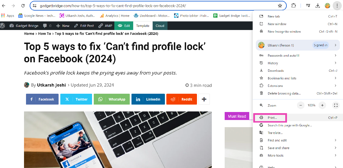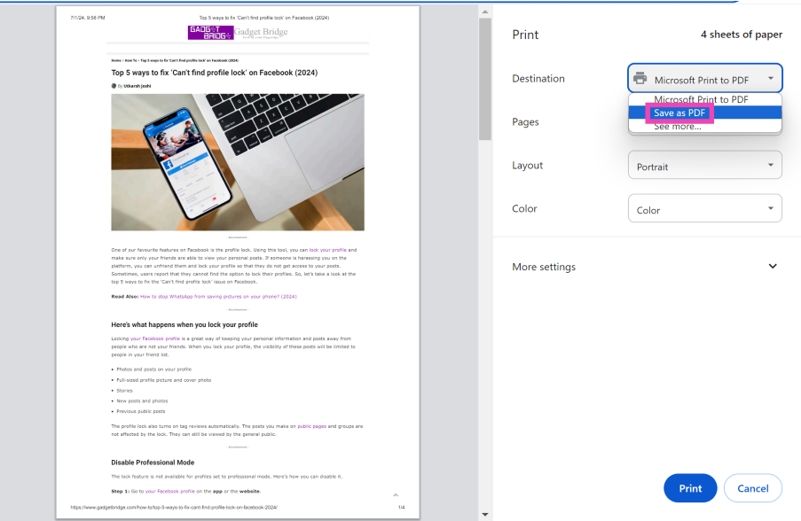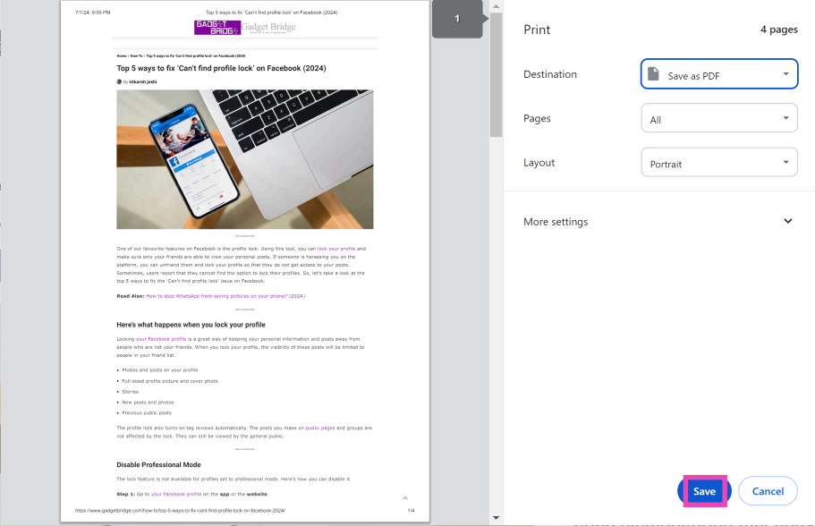 Google Chrome'daki web sayfasını açın, Elipses'e tıklayın, 'Yazdır' seçin, açılır menüye dokunun, 'PDF olarak kaydet'i seçin ve' Kaydet 'tuşuna basın.