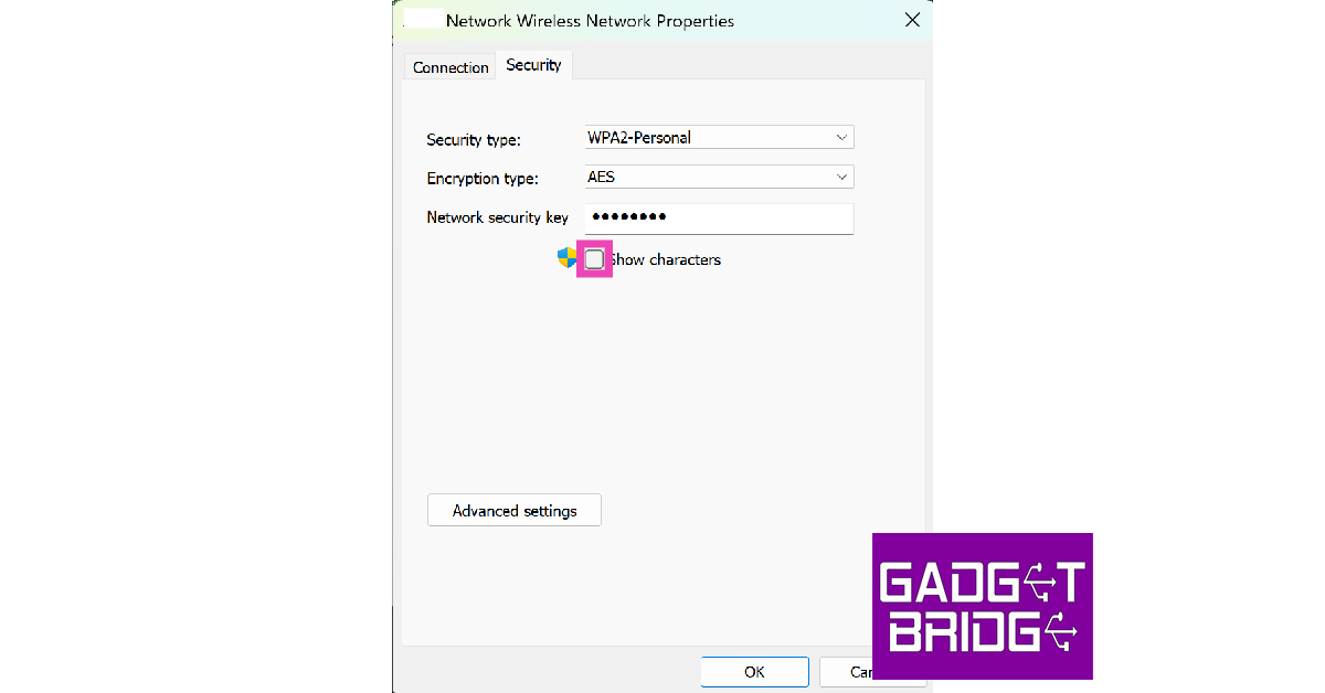 Adım 9:Onay kutusunu tıklayınKarakterleri GösteraltındaAğ Güvenlik Anahtarıalan.