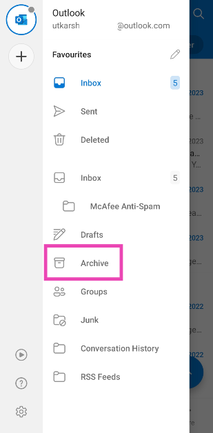 'Arşiv' klasörü genellikle sol kenar çubuğunda bulunabilir. Windows Outlook uygulamasında, klasörü görüntülemek için e -postanızın yanındaki ok simgesini tıklamanız gerekir. Android kullanıcılarının, erişmek için ekranın sol üst köşesindeki profil simgesine dokunmaları gerekir.