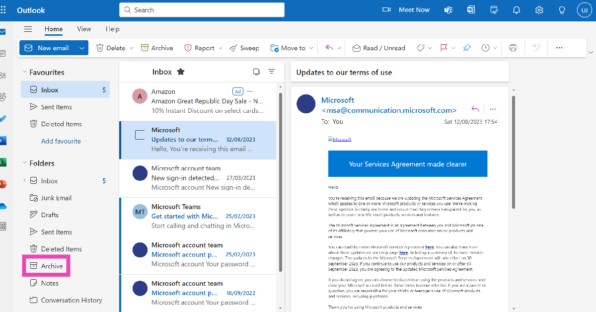 2. Adım:TıklayınArşivArşivlenen tüm e -postalarınızı görüntülemek için sol kenar çubuğunda.