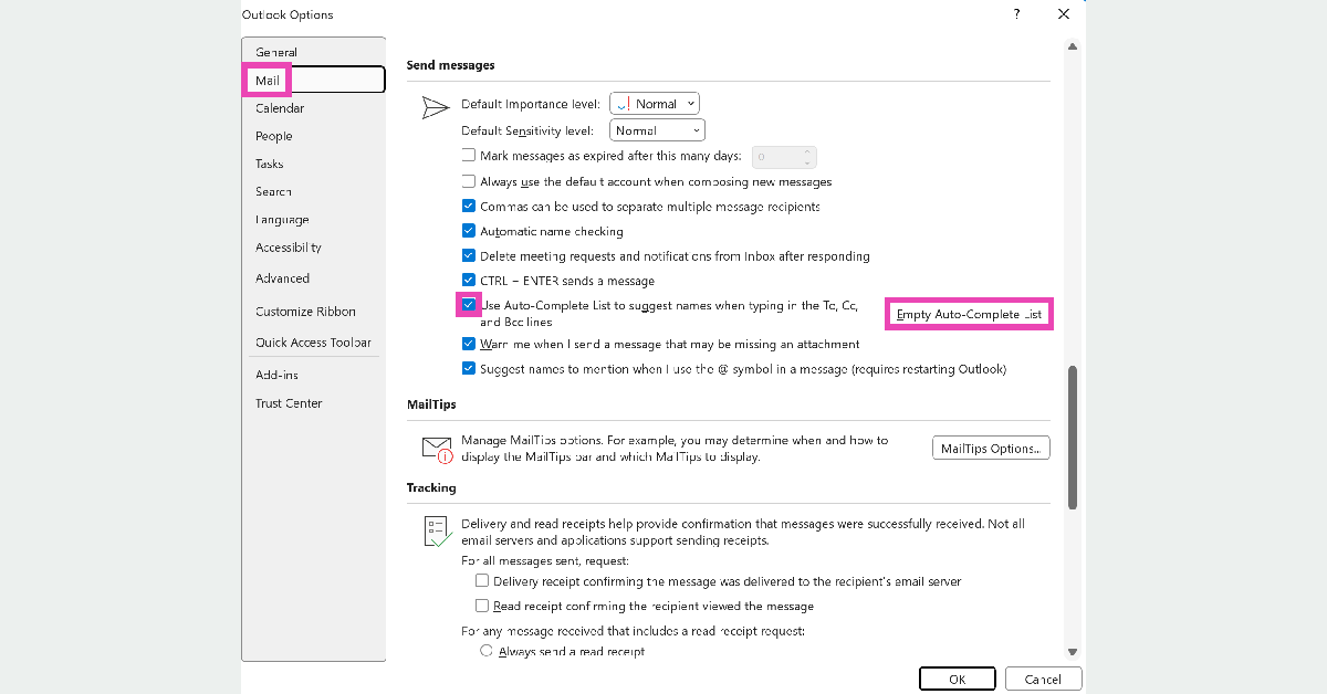 4. Adım:Deselect 'TO, CC ve BCC çizgilerini yazarken adları önermek için otomatik tamamlama listesini kullanın'. TıklayınBoş Otomatik Tamamlama Listesiilave olarak.
