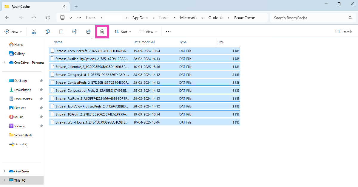 Outlook'u (klasik) başlatın ve gidinDosya> Hesap Ayarları> Veri Dosyaları> Depolama Konumunu Aç> RoamCacheve klasörün içeriğini temizleyin.