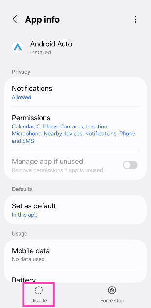 Gidip gelmekAyarlar> Uygulamalar> Android Autove ekranın altındaki 'devre dışı bırak'.