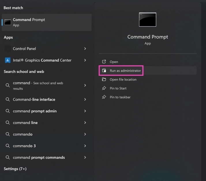 1. Adım:AraştırmakKomut istemiGörev çubuğunda ve seçinYönetici olarak çalıştırsonuçlardan.