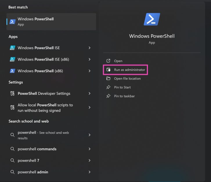 1. Adım:TipPowershellGörev çubuğundaki arama alanına girin veyönetici.