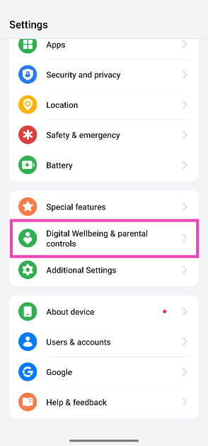 1. Adım:Gidip gelmekAyarlarve seçDijital Refah ve Ebeveyn Kontrolleri.