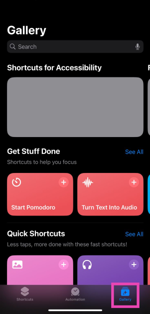 1. Adım:BaşlatmakKısayollar uygulamasıiPhone'unuzda veGalerisekme.