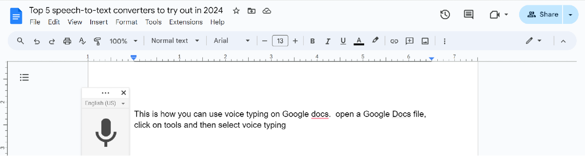 PC'nize bir konuşma-metin dönüştürücü aracı kurmak istemiyorsanız, Google Dokümanlarında yerel ses yazma özelliğini kullanabilirsiniz. Bu, hareket halindeyken çok kullanışlıdır ve dizüstü bilgisayarınızı ve tipini dinlendirmek için istikrarlı bir yer bulamıyor. Google Doc'un ses yazma aracı mükemmel değil, ancak işi hallediyor. Metni dikte etmeyi bitirdikten sonra hataları ayıklamanız gerekecek, ancak ücretsiz bir araç için bu kadar iyi.