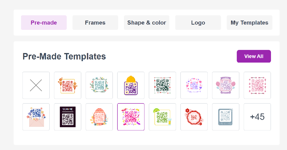 Adım 5:Önceden yapılmış birtasarım şablonuQR kodu için veyaÖzelleştirme Seçeneklerisayfada listelenmiştir.