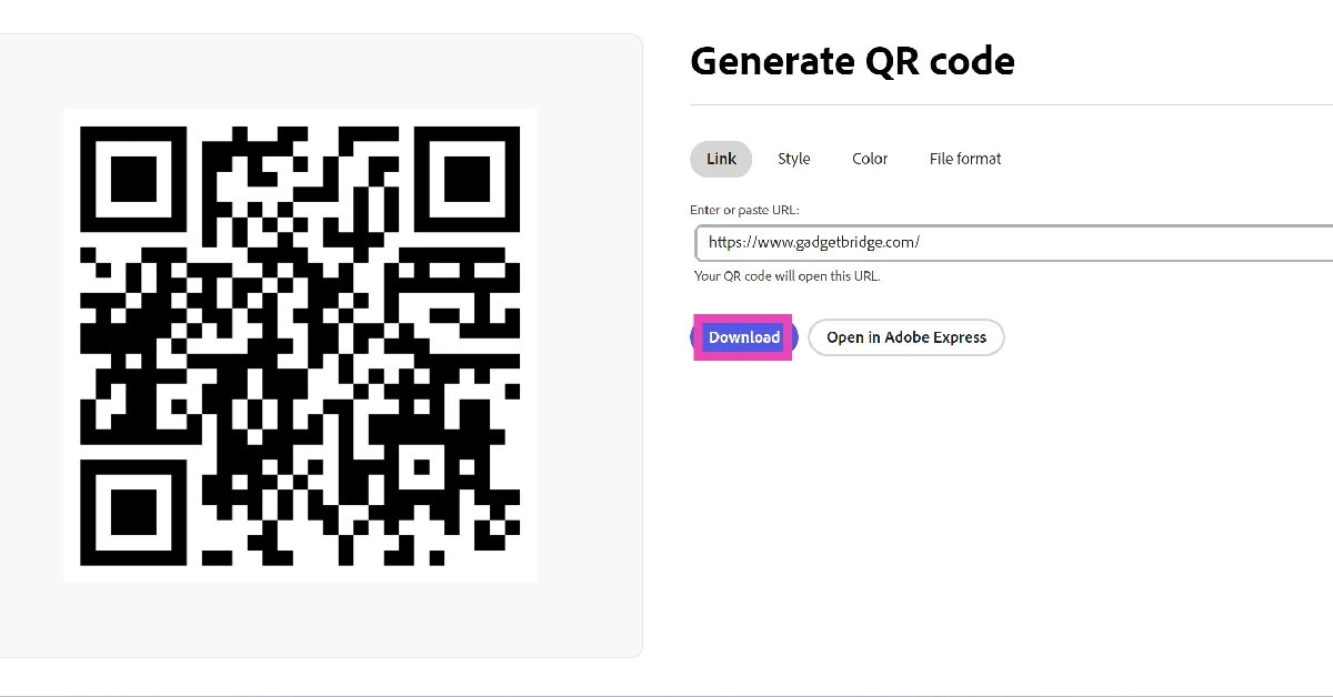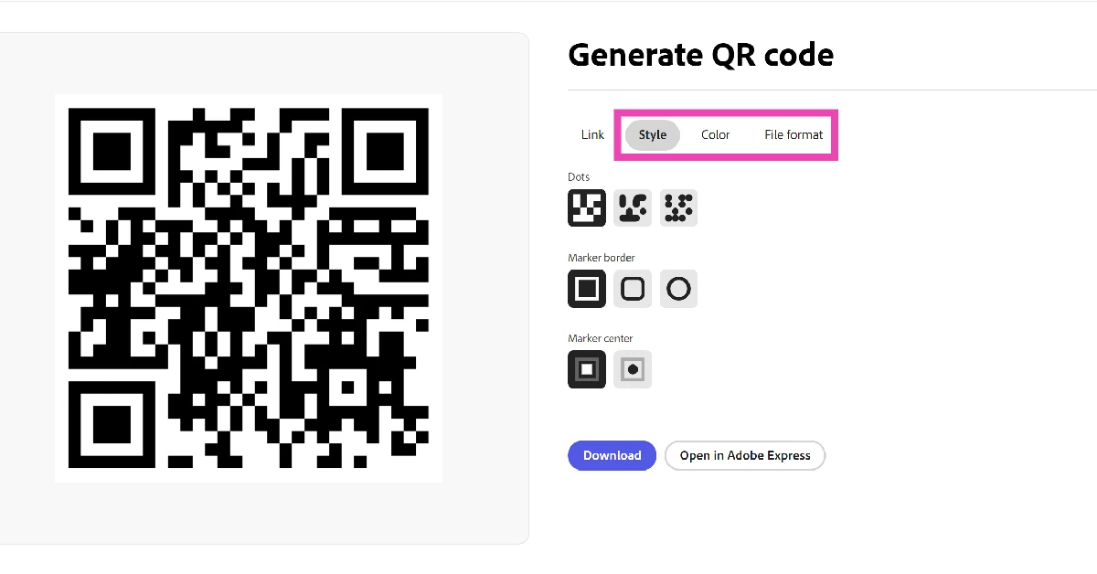3. Adım:SeçStil-Renk, VeDosya biçimiQR kodu için.