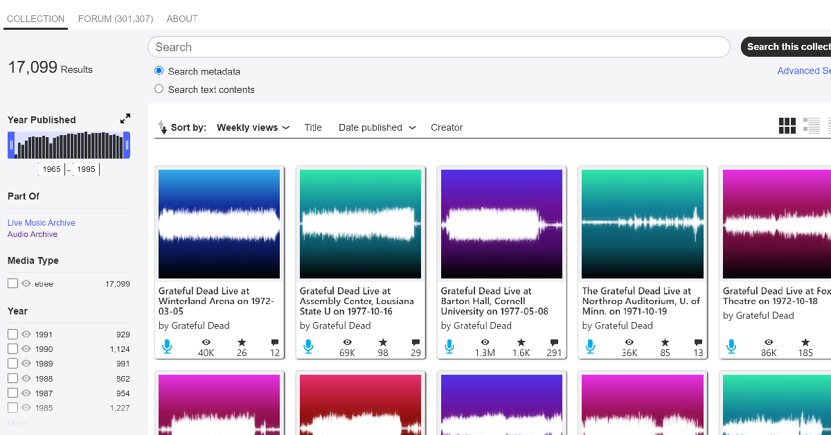 .İnternet ArşiviÜcretsiz kitap, film, müzik, yazılım ve daha fazlasının inanılmaz bir çevrimiçi deposudur. Web sitesinden ücretsiz olarak indirilebilecek 14 milyondan fazla ses kaydı var. Bu, popüler ve çağdaş sanatçıları bile içerir. Canlı müzik dinlemeyi seviyorsanız, internet arşivinde konserlerin bootleg kayıtlarını da bulabilirsiniz. Tek yakalama, bu web sitesinden indirilen müziğin ticari amaçlarla kullanılamamasıdır. Ancak, hedefiniz sadece müzik dinlemekse, TIA en iyi ücretsiz kaynaklardan biridir.