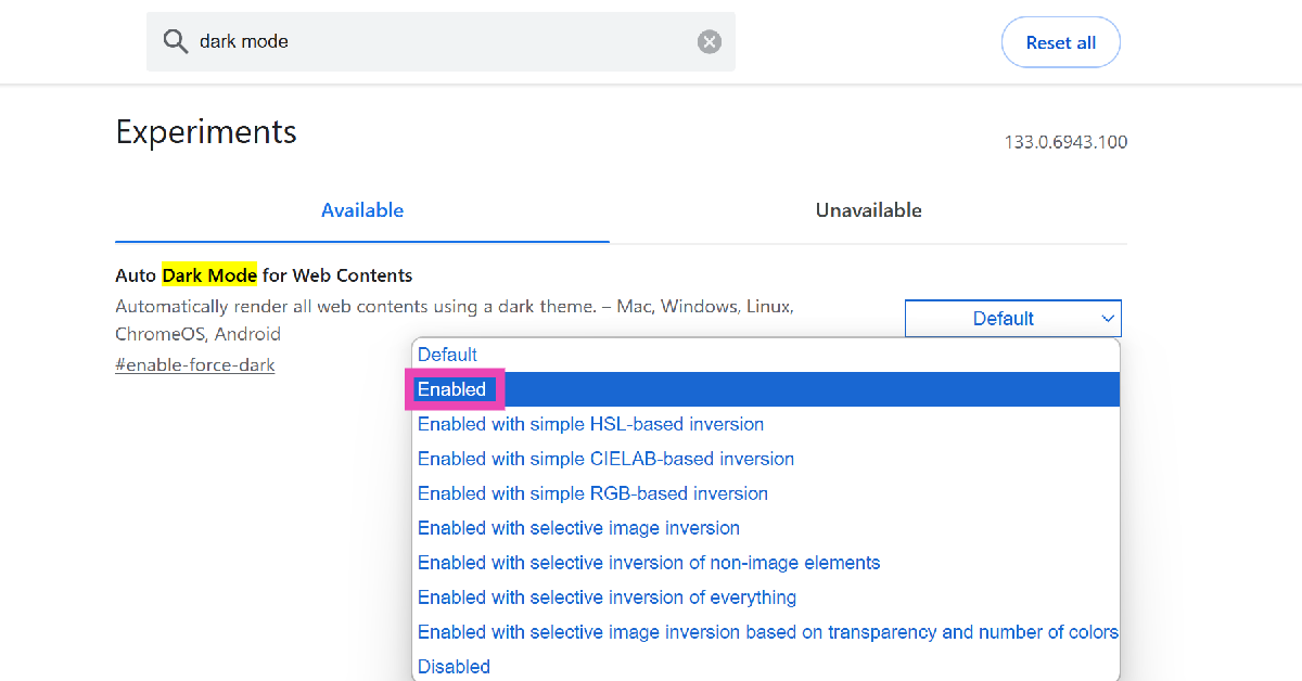 Chrome: // Flags'a gidin, 'Karanlık Modu' arayın, 'Web İçeriği için Otomatik Karanlık Modu' yanındaki açılır menüyü basın ve 'etkinleştir' seçin.