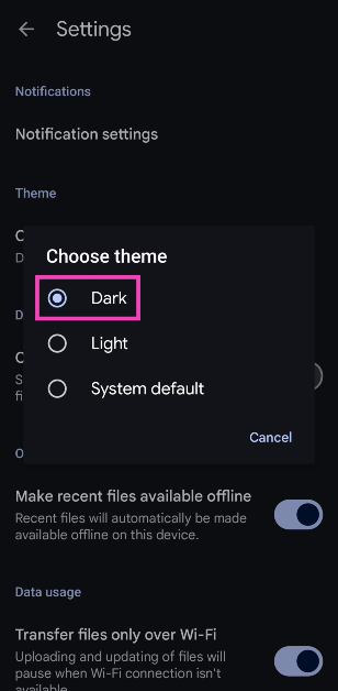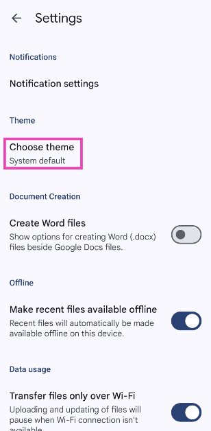 Android ve iOS için Google Docs uygulaması birkaç tema sunuyor. Varsayılan olarak, uygulama telefonunuzun görsel temasına bağlıdır. Telefonunuzun arayüzünün geri kalanını değiştirmeden uygulamaya karanlık temayı uygulamak istiyorsanız, listeden uygun seçeneği seçebilirsiniz.