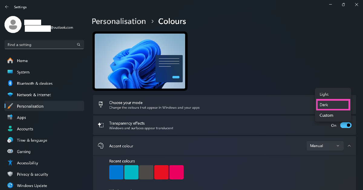 3. Adım:Yandaki açılır menüyü tıklayın.Modunuzu seçinve seçKaranlık.