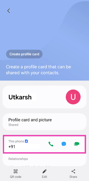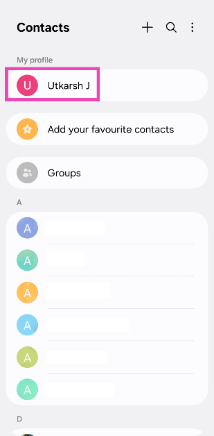 Native Samsung Kişiler Uygulamasını başlatın ve numaranızı görüntülemek için adınızı ekranın en üstüne dokunun.