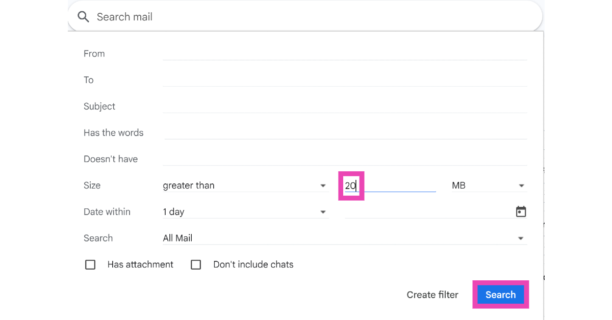 Filtre simgesine arama çubuğuna basın, minimum boyut girin ve 'Ara' tuşuna basın. Alternatif olarak, arama çubuğuna daha büyük: 20m yazın ve 20 metreden daha büyük e -postaları filtrelemek için enter tuşuna basın. Gelen kutunuzu filtrelemek için '20' tercih ettiğiniz boyutla değiştirin.