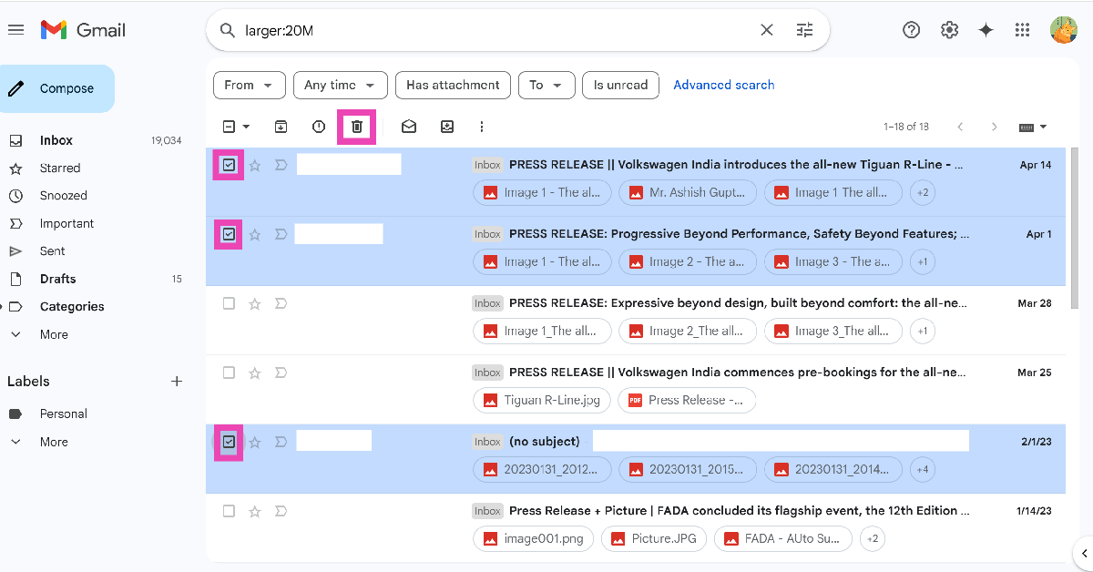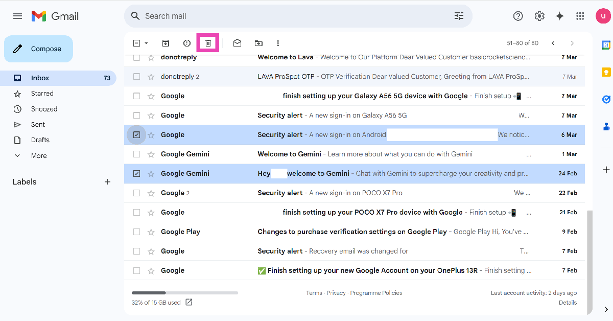 Adım 6:Vurmakonay kutususilmek istediğiniz e -postaların yanında veçöp simgesiaraç çubuğunda.