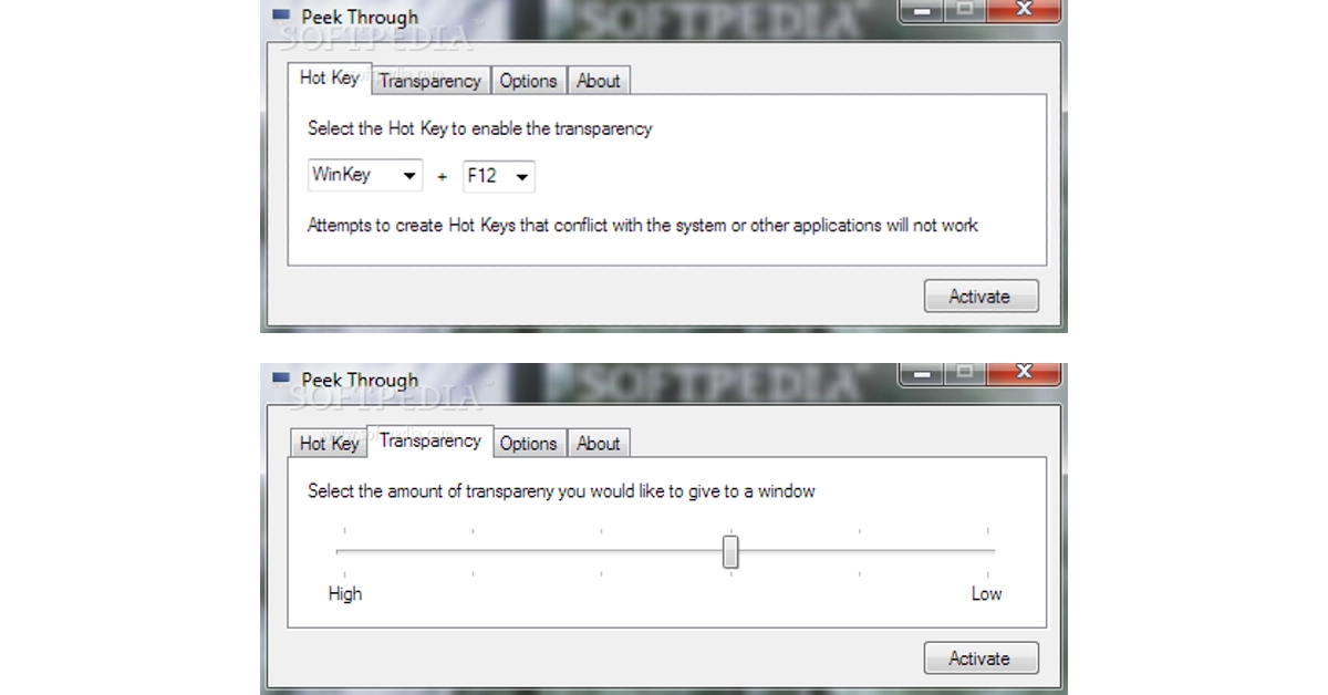 Peek, Windows'u Windows 10/11 PC'nizde veya dizüstü bilgisayarınızda şeffaf hale getirmek için başka bir harika araçtır. Bu yazılımı Softpedia'dan ücretsiz olarak indirebilirsiniz. PEEK'i başlattıktan sonra, yazılım şeffaflık efekti için bir hotkey kurmanızı ister. Şeffaflık etkisini bir pencereye uygulamak için bu hotkey'i herhangi bir zamanda kullanabilirsiniz. Efekt için bir seviye ayarlamak için 'Şeffaflık' sekmesini kullanın. Bu yazılımı başlangıçta çalışacak şekilde de ayarlayabilirsiniz.