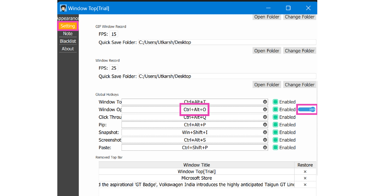 Windowtop'ta şeffaf pencereler için varsayılan klavye kısayoluCtrl + Alt + O.