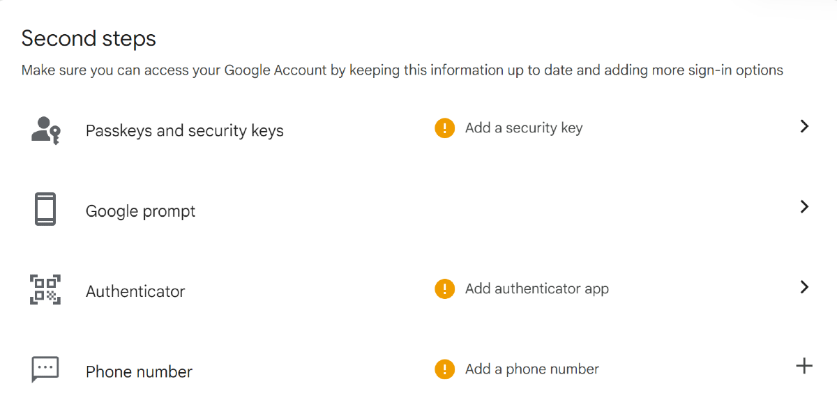 Adım 5:Nasıl istediğinizi seçindoğrulamakGiriş girişiminiz. Google size aşağıdaki seçenekleri sunar - passeyler ve güvenlik anahtarları, birincil cihazınızdaki Google istemi, kimlik doğrulayıcı uygulamaları ve telefon numarası.
